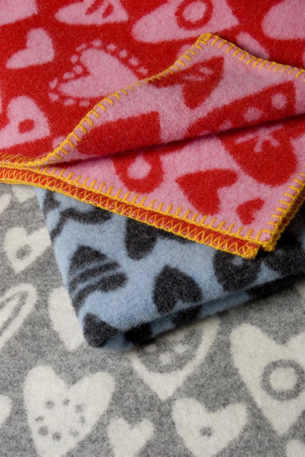 Het kinderdeken Baby Heart van Klippan Yllefabrik wordt uit ecologisch wol geweven, en is daarmee vrij van giftige stoffen en is kindvriendelijk. Beschikbaar in grijs, blauw en rood/roze.